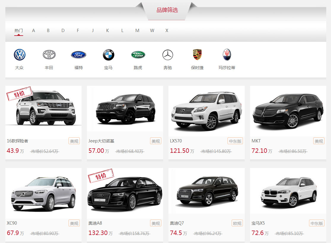 快速筛选:提取车型的首字母,自动归类,以品牌图标+字母的形式,为用户提供快速筛选途径。