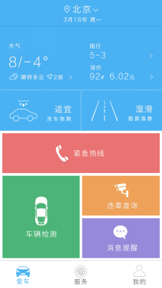 爱车模块:车辆检测、天气、限行、油价、紧急热线、违章查询等功能。