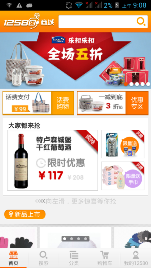 客户端导航模块:首页、搜索、分类、购物车、我的12580