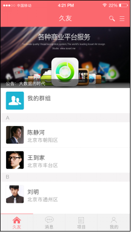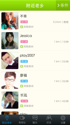 用户列表:基于LBS显示附近用户,并提供距离、家乡等条件进行筛选。