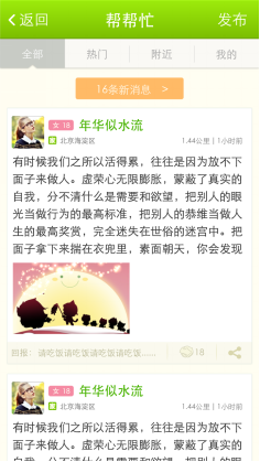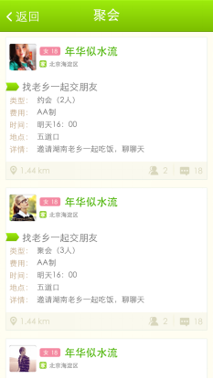 活动聚会:用户发布活动主题,标明时间、地点、人数等相关信息,邀约用户参与。