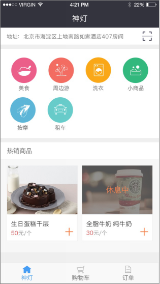 神灯酒店项目以用户入住酒店后,所需的美食、干洗、健身、娱乐、租车等商旅方面的需求为主要服务场景。根据酒店位置臻选出的附近优质服务项目,提供上门服务。同时,通过个性化的客房定制服务,可全面提升顾客入住体验,开创客房服务市场多赢的局面。
