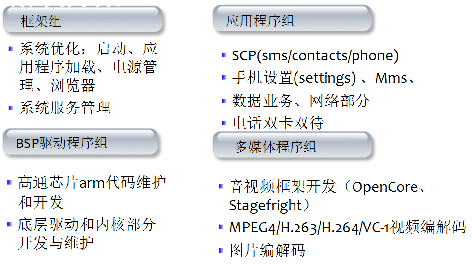 该项目是与国内著名的手机生产厂商合作开发的项目,其生产的手机多年销量和市场占有率领先,这款手机是2013年上市的一款基于Android4.1的产品,是市场上最早基于Android4.1的产品之一,一上市便受到用户的追捧。项目基于Android4.1和高通芯片平台,横向的分为联通定制版本、移动定制版本、Android原生平台版本,纵向的项目分为上层app应用层、框架中间层、驱动层。