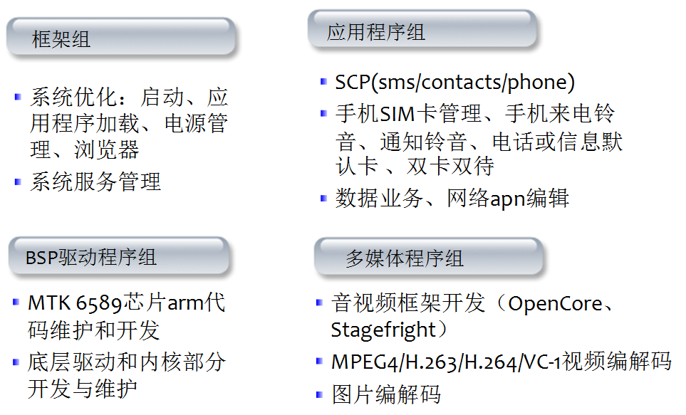 该项目是与国内某集团公司合作开发的手机产品,该手机是基于Android4.2和MTK平台的大屏幕高端手机,芯片是MTK6589,高清分辨率屏幕,分移动定制和联通定制版本,支持WCDMA和GSM网络制式,手机支持情景模式选择和用户自定义情景模式。项目分为上层app应用层、frameworks中间层、多媒体、驱动层。